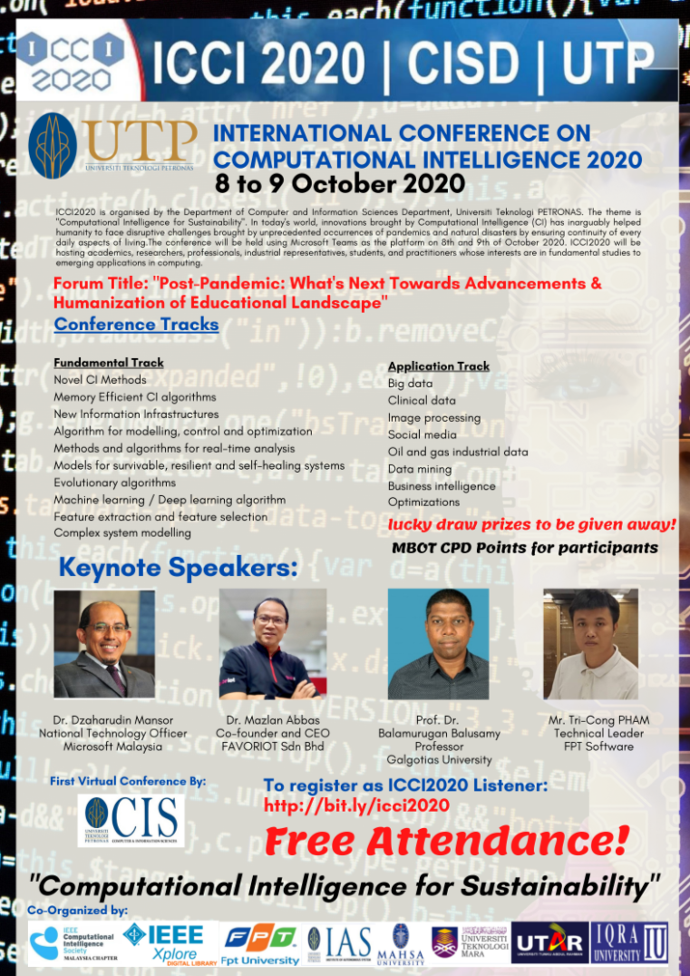ICCI2020 is organised by the Department of Computer and Information Sciences Department, Universiti Teknologi PETRONAS. The theme is "Computational Intelligence for Sustainability". In today's world, innovations brought by Computational Intelligence (CI) has inarguably helped humanity to face disruptive challenges brought by unprecedented occurrences of pandemics and natural disasters by ensuring continuity of every daily aspects of living.The conference will be held using Microsoft Teams as the platform on 8th and 9th of October 2020. ICCI2020 will be hosting academics, researchers, professionals, industrial representatives, students, and practitioners whose interests are in fundamental studies to emerging applications in computing. Participants will share and learn computational models and tools of intelligence capable of handling large raw numerical sensory data directly from storages or streams; processing them by exploiting the representational parallelism and pipelining the problem; and generating reliable just-in-time responses. The organiser welcomes presentation of recent results related to CI algorithms, software systems and architecture, data analytics, current challenges, and new-and-emerging applications. Presentations related to the industry, novel applications and emerging CI theory and concepts are strongly encouraged.